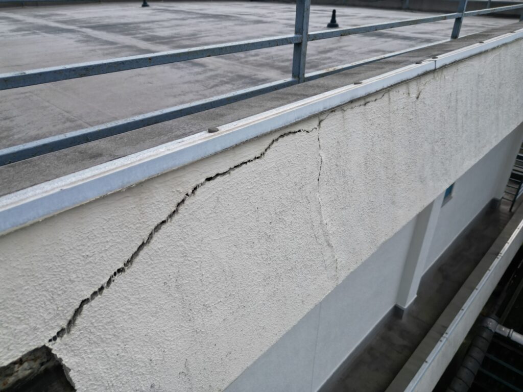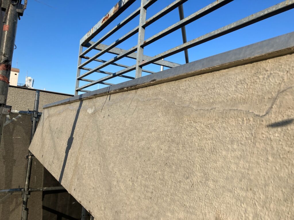 「屋上バルコニーの壁が崩れ落ちてきた」とお客様から緊急のご連絡をいただきました。