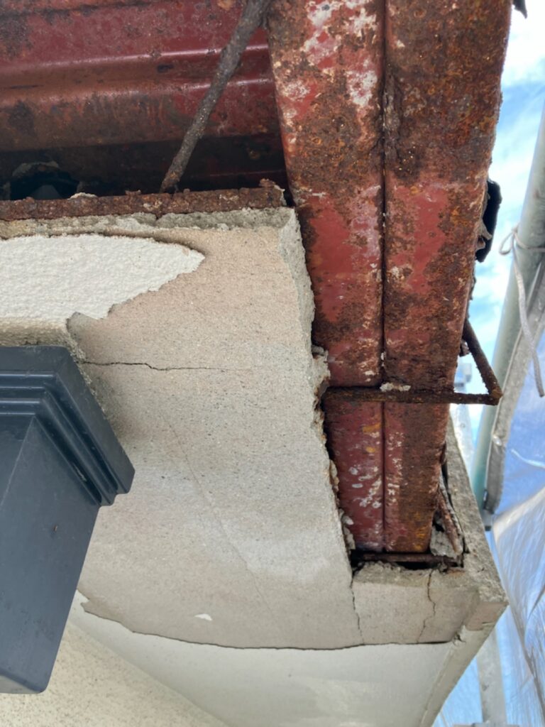 外壁の一部が剥がれ、内部の鉄筋が錆びて膨張している状態です。
