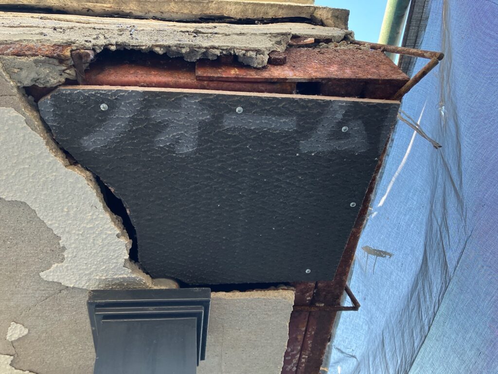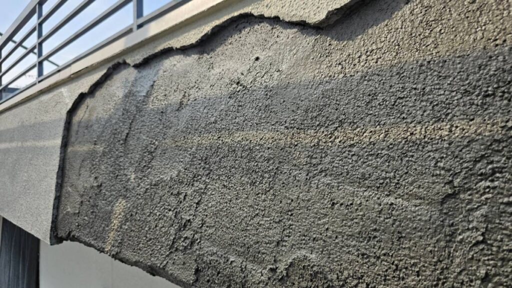 長年の雨水浸入や経年劣化により、内部の鉄筋が錆びて膨張し、外壁が浮いて剥がれていました。