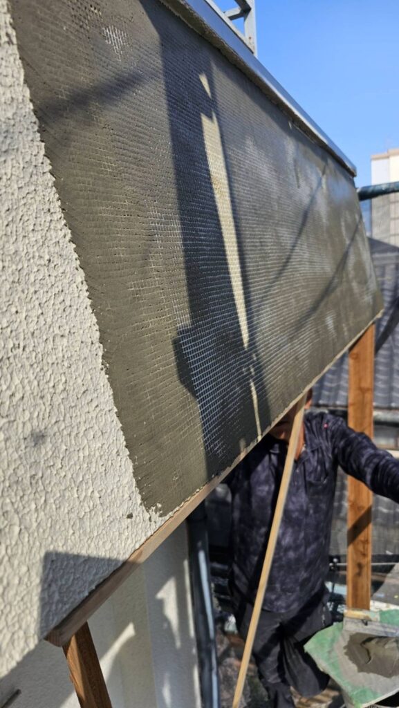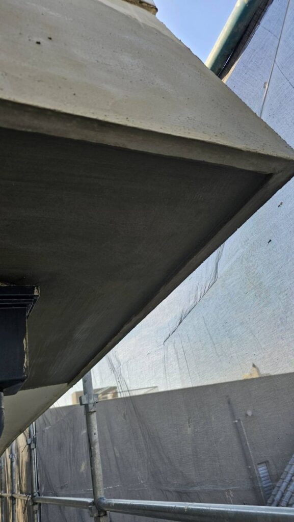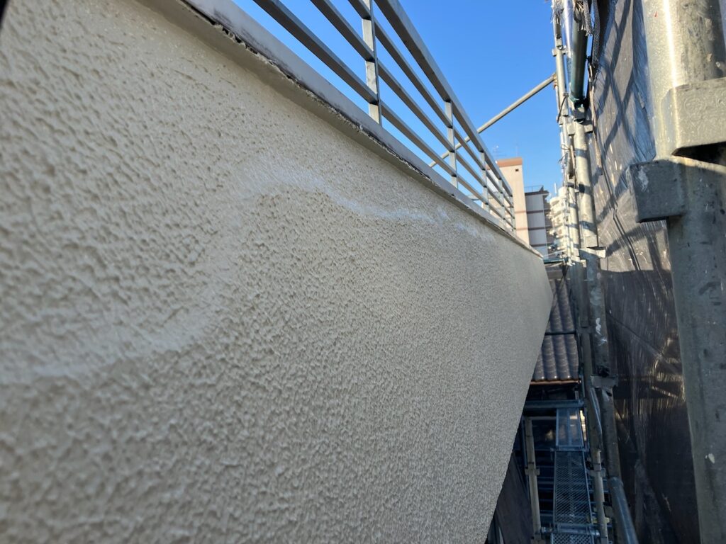 下地処理後のモルタル補修。強度を確保し、仕上げ塗装に備えます。