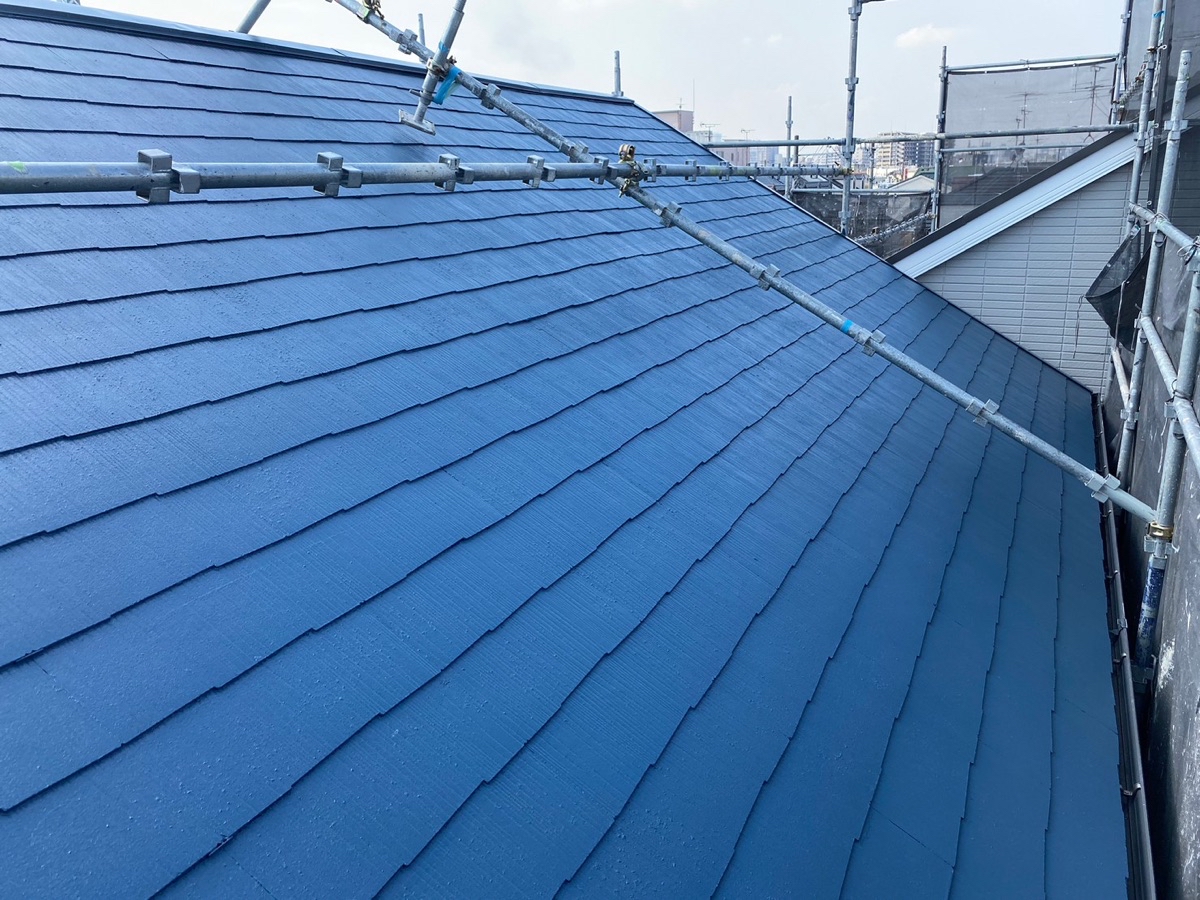 外壁はアステックペイント「超低汚染プラチナリファイン2000MF-IR」のエクリュ色、屋根は「超低汚染リファイン500MF」のマウンテンブルーを採用。落ち着きのある外壁に爽やかな屋根色が映える、美しい仕上がりになりました。