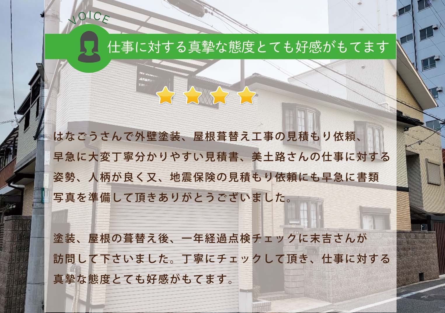 はなごうさんで外壁塗装、屋根の葺き替え工事の見積もり依頼、早急に大変丁寧分かりやすい見積書、美土路さんの仕事に対する姿勢、人柄が良く又、地震保険の見積もり依頼にも早急に書類、写真を準備して頂きありがとうございました。施工着工に入り、協力業者さんが作業をして下さったが、仕事に対する意識が少し低いように感じました。。最終チェックは美土路さん末吉さんが来て下さり、安心して終える事に成りました。又、これからも引き続き外壁、屋根等のチェックを宜しくお願い致します。ありがとうございました。